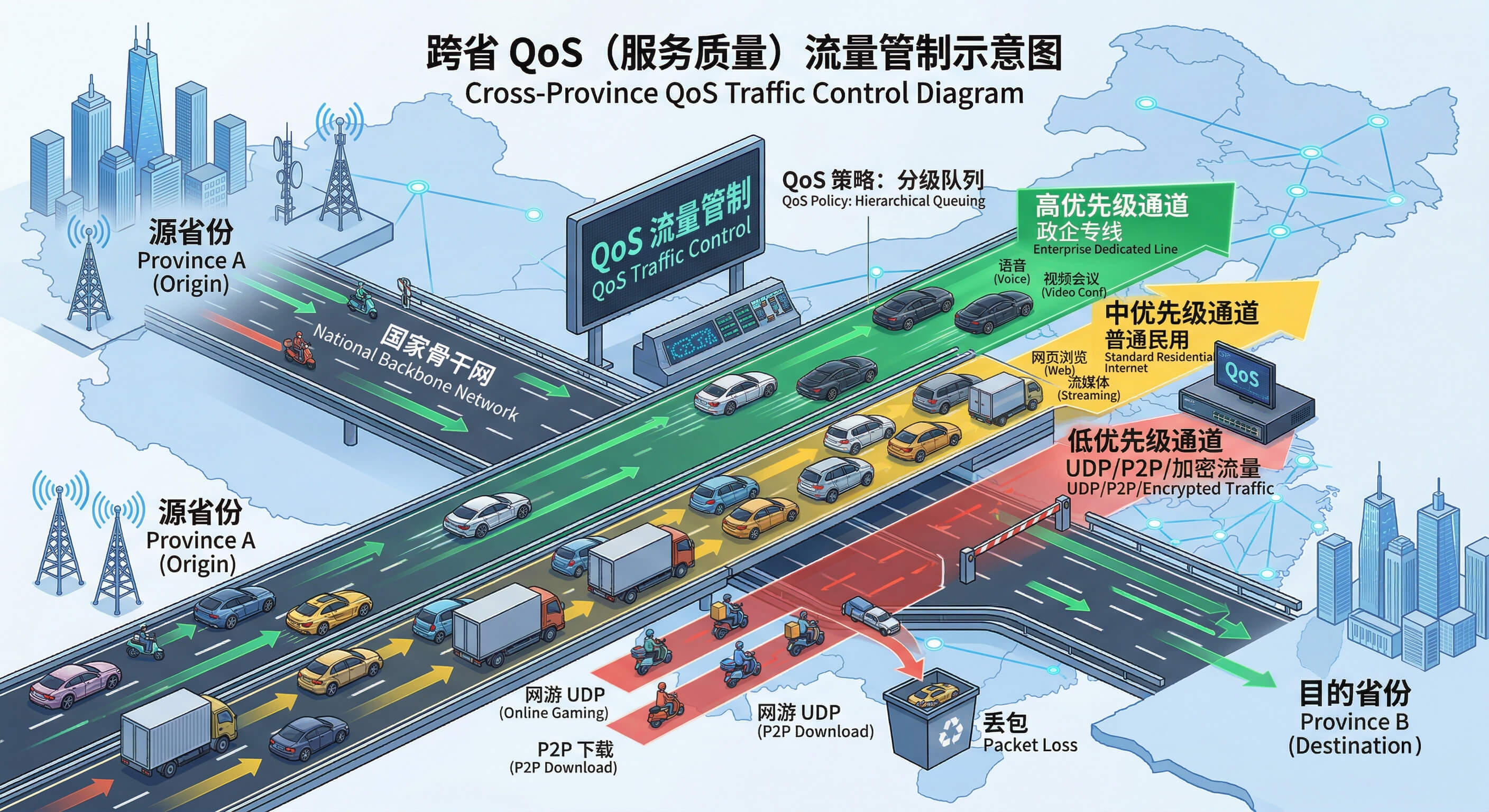 每个省份内部的网络(城域网)通常非常宽敞,就像城市里的环路。但当你要访问外省内容时,数据必须通过省际出入口路由器。 这些出入口就像是高速公路的“省界收费站”,虽然一直在扩容,但永远赶不上短视频、直播和 4K 视频带来的流量爆炸。当带宽利用率接近临界值时,运营商就会开启 QoS 策略,通过“丢弃一部分包”来保住整个骨干网不至于瘫痪。